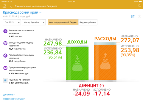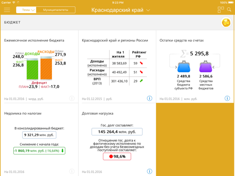 Приложение отражает актуальную официальную информацию и позволяет анализировать экономическую, финансовую и социальную сферы Краснодарского края.