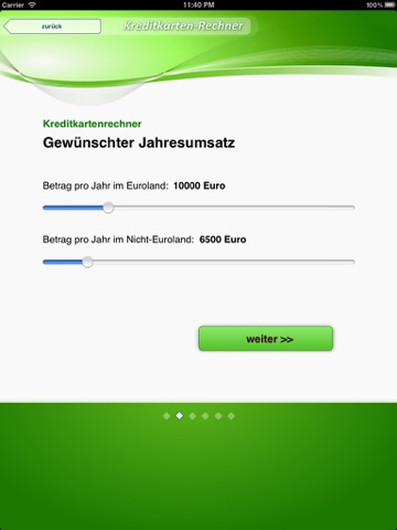 Sie haben ausführliche Filter-Möglichkeiten. Geben Sie einfach Ihren geschätzten Jahresumsatz ein und vergleichen Sie unzählige Kreditkarten verschiedener Anbieter. Mit dieser App finden Sie mit Sicherheit die Kreditkarte, die zu Ihnen passt! Dank des Abrufs der neuen Daten über das Internet erhalten Sie stets aktuelle Werte und einen sehr guten Vergleich zu unterschiedlichen Kreditkarten.
