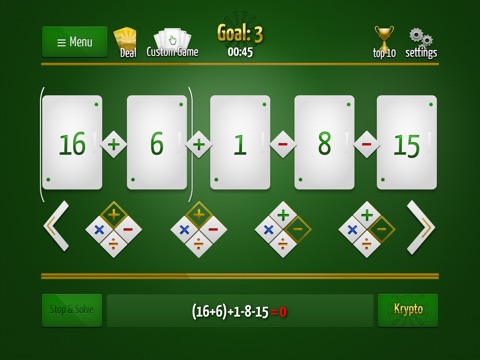--In addition to basic arithmetic operations, Krypto-Plus lets you play your hand with the Factorial operator, adding even more possible ways to win!