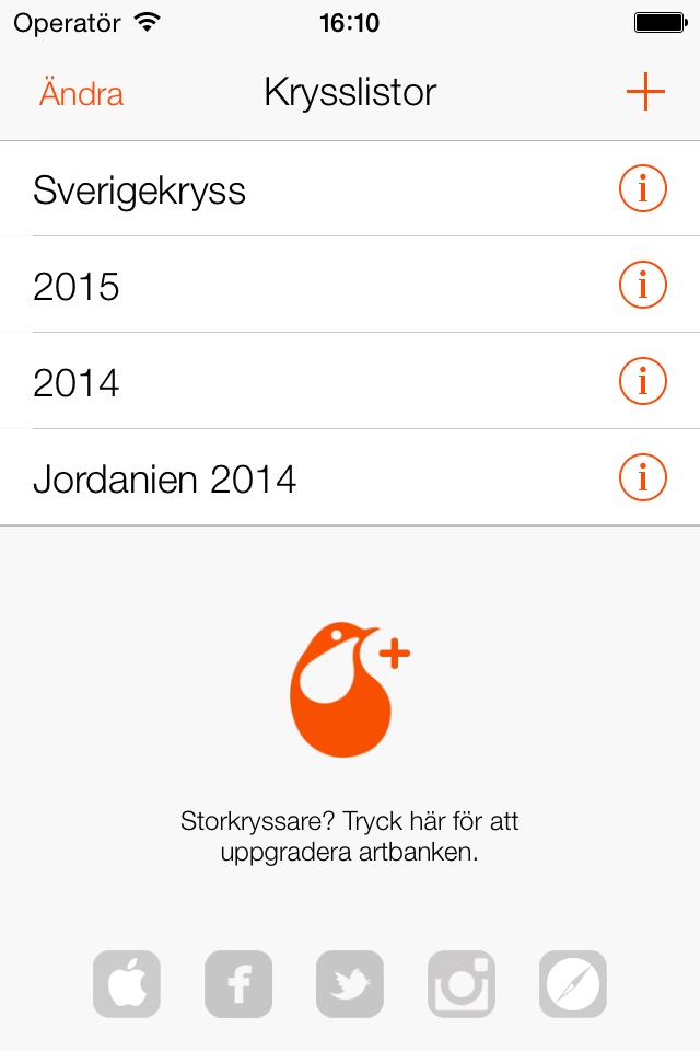 Krysslistan innehåller Sveriges vanligaste 300 fågelarter med möjlighet att utöka till samtliga fågelarter som skådats i Sverige eller hela Västpalearktis.