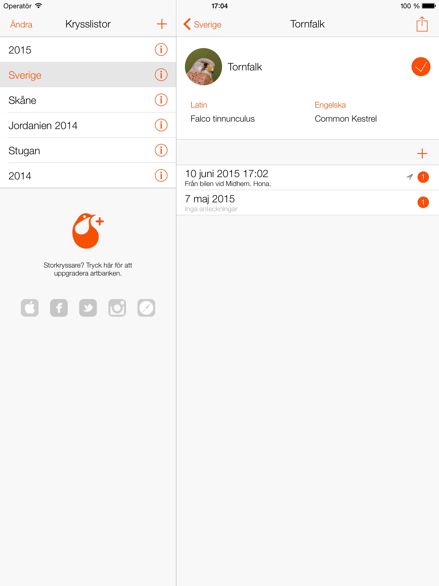 • Håll koll på vilka fåglar du har sett var och när