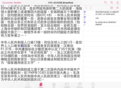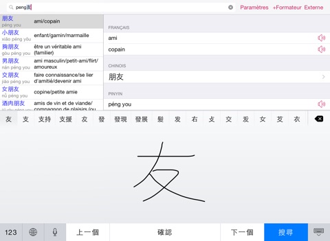 Search: Includes the data of the renowned CFDICT dictionary with over 60,000 entries - no Internet connection required. Search using French, Chinese characters and Hanyu Pinyin. Use Chinese handwriting recognition or voice input of iOS to enter Chinese easily.