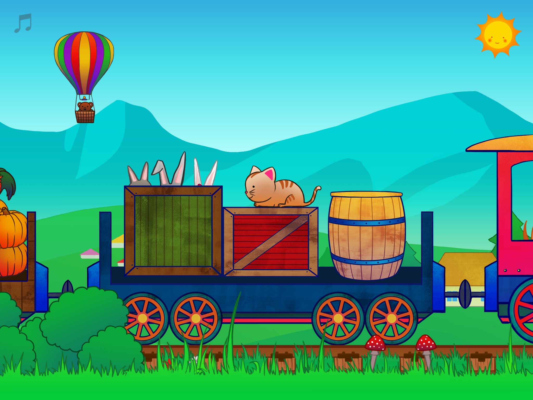 يرجى تنزيل التطبيق للحاق بالكلب سائق القطار ومجموعة ركابه من الحيوانات في رحلتهم. اطلب من الطفل أن يضغط على على الأشياء والحيوانات المختلفة التي يراها، كالقطة، أو الحصان، أو الإوزة الشريرة، المعزاة الجائعة، أو البقرة النائمة. أو لمس الشمس الساطعة في السماء، أو الغيوم، أو أي شيء موجود في الصورة، ليرى ماذا سيحدث.