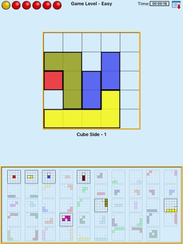 Kube Shapes offers you three levels of difficulty on each of the 3x3, 4x4, 5x5, 6x6 and 7x7 puzzle grids. Try out the easy level and progress through the hard and expert levels. Use the built-in timer to test yourself against the clock!