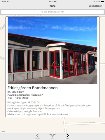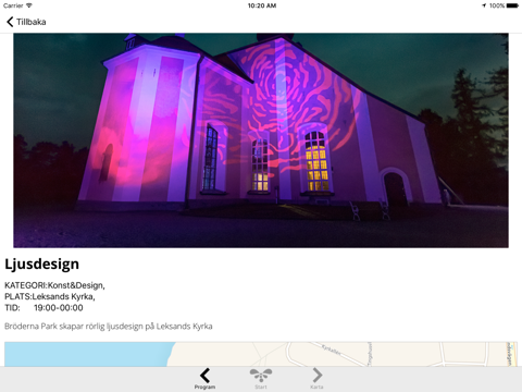 Klicka till vänster för att komma till programmet eller till höger för att se kartan. Här kan du sortera bland de olika kategorierna, söka bland programpunkter, välja ut dina egna favoriter och klicka på evenemangen i listan för att se bilder och få mer information. Vill du dela information om en programpunkt kan du göra det på alla sociala medier du har tillgång till på din telefon eller platta, och även via mejl eller sms. Appen kommer att uppdateras med mer info både fram till och under Kulturkalaset, så håll ögonen på den.