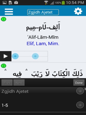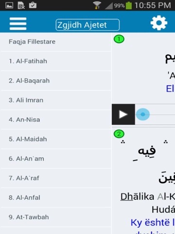 Vetëm klikoni një sure dhe nën ajetin e parë klikoni buttonin Play dhe do të fillojë këndimi i të gjitha ajeteve njera pas tjetrës.