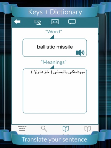 4. Almost all the commonly used words of both languages e.g. The English and Kurdish are available here in dictionary, however in case of any exception user may take support of built-in Translator within application to find meaning of new words but it needs internet to translate.