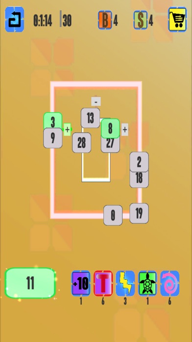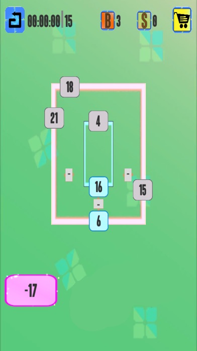 You have numbered cubes that move between different operators. Choose the right combination or path that will take you to the right result, placed in the pink frame at the bottom left of the screen.