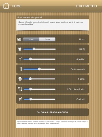 Inserisci i tuoi dati e che coshai bevuto durante la serata, il programma ti consiglierà se puoi guidare o dopo quanto tempo raggiungerai la soglia legale.