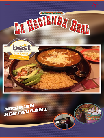 La Hacienda Real, best known for their homemade TORTILLAS and MARGARITAS At La Hacienda Real Mexican Restaurant, we serve a wide variety of authentic Mexican dishes and traditional Mexican combination platters. From our sizzling fajitas and zesty burritos to our spicy, tasty enchiladas, we take pride in using the finest ingredients to serve our guests. Salads and soups are also available for both lunch and dinner.