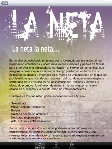This application streams the music broadcast with no publicity from the Radio Station La Neta Radio. Broadcasting 24 hours a day, every day of the year. Listen to the best music from the 70s up to todays greatest hits.
