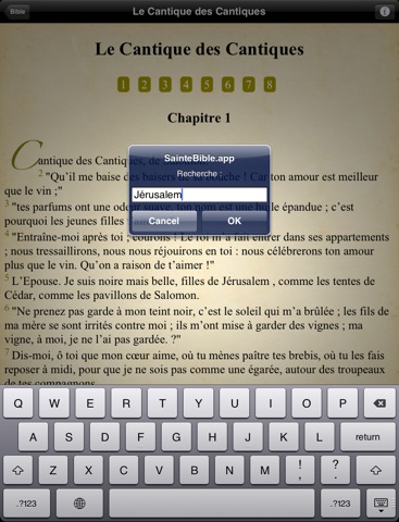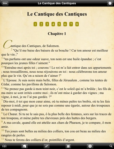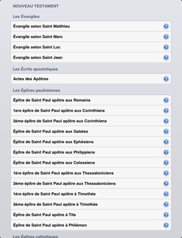 Cette caractéristiques de lAncien et du Nouveau Testament, avec un facile à utiliser la table des matières. En quelques clics, vous pouvez naviguer vers un verset que vous voulez. Vous pouvez sélectionner le chapitre que vous voulez, puis faites défiler pour trouver le verset que vous avez besoin.