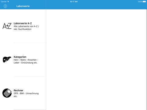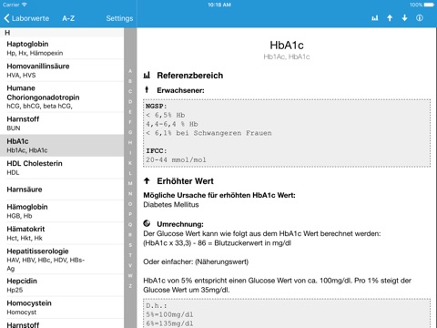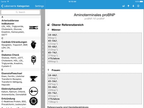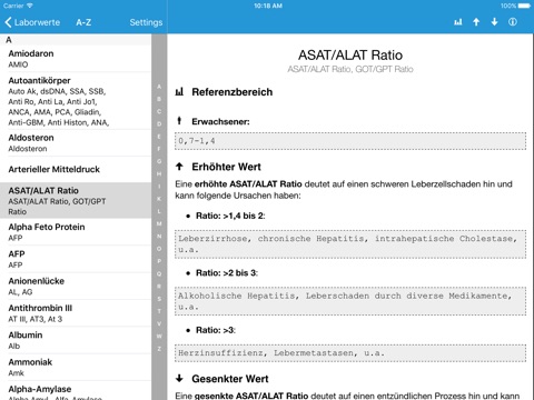 Diese Laborwerte App gibt sowohl Medizinern als auch Nichtmedizinern einen allgemein verständlichen, schnell navigierbaren und übersichtlich aufgebauten Überblick über die wichtigsten Routinelaborparameter und mögliche Ursachen über deren Erhöhung und Senkung. Die Laborwerte sind sowohl alphabetisch im Menüpunkt A-Z angeordnet als auch unter den betreffenden Kategorien auffindbar. Die Normwerte werden sowohl in den alten Einheiten als auch SI-Einheiten angegeben.