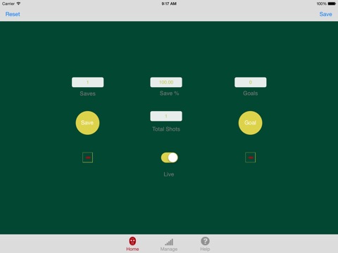 As you will see the interface for recording a game looks very familiar, but along with the new graphics, there are some new features. Just like before, just tap the Save button to record a save, and the goal button to record a goal. iGoalie will then calculate your save percentage, and display it on the screen. If you hit the wrong button simply tap the correct minus button (- save, - goal). To reset a game simply press the reset button. One new feature you will notice right away is a switch at the bottom of the screen labeled “Live”, this switch prevents your iPhone from going to sleep while you are recording a game, simply tap the switch to toggle this feature on or off. When you are done recording a game, simply tap the “save game” button, this will present you with the save game, and social