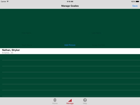 goalie. To add a goalie, simply enter their first and last name, as well as their team, and their jersey number, then click save. Instantly the new goalie will be added to the list of available goalies. To delete a goalie simply swipe across their name, the delete button will appear, and you can remove them from the list.