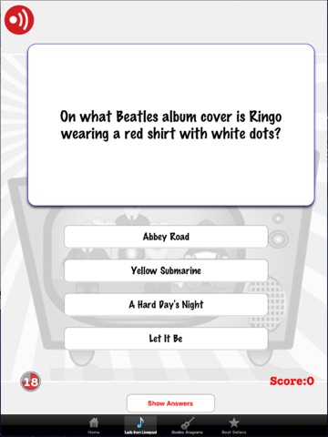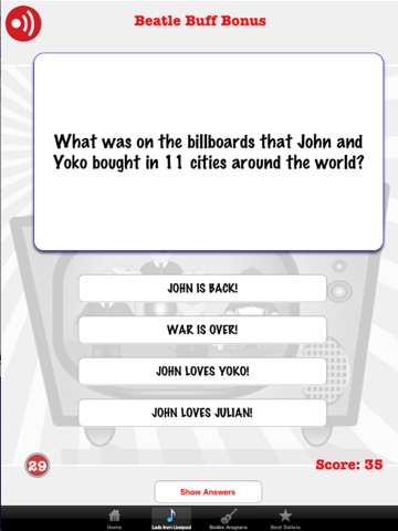 As heard on BeatlesRadio.com! Its trivia for the true fan. Think you know all there is to know about the band? Well its time to find out. The app offers you over 500 questions delving deep into the music, history, members and life of the greatest rock band in history. Race against the clock and even challenge other Beatles Buffs on Game Center!