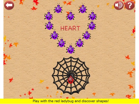 3. Shapes: We have taken an unique approach in teaching shapes. One just need to drag the red Ladybug in the web and all the other ladybugs congregate and make a shape! Releasing and dragging the red Ladybug again to the web gives another shape and the fun goes on.
