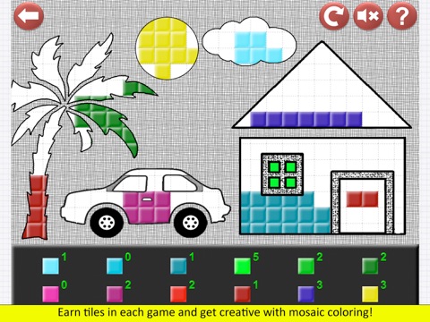 7. Reward Game: To encourage the kids to play and learn more, we have developed a coloring reward game. As the child finds correct answer to the questions, he/she can earn colored tiles in the games. With the earned colored tiles, the child can color the scene creatively. This encourages the child to get more correct answers so that he/she can collect the tiles of his/her choice. We believe this is an unique reward system which encourages creativity and provides the motivation to solve more questions and hence learn more.
