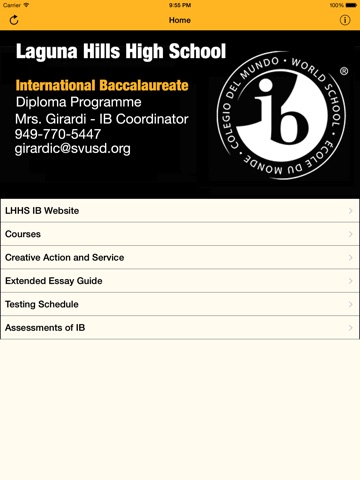 This Laguna Hills HS IB app allows parents, students, faculty, and staff the ability to quickly access information about the schools International Baccalaureate program.
