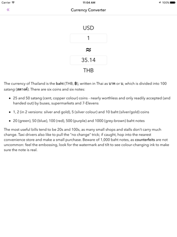 - Landed explains the local currency and where to change money, and has a currency converter.