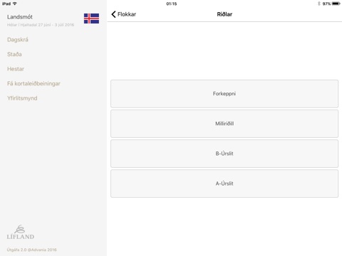 Information about Landsmót 2016. The app is for contestants and guest where they can see details of the program, results and other information.