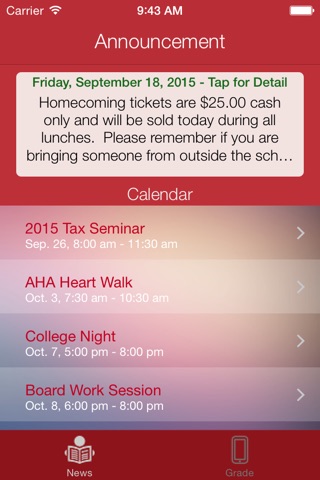 The first tab shows everydays announcements, calendar, latest news, and lunch menu. These will help you stay connected to the latest information.