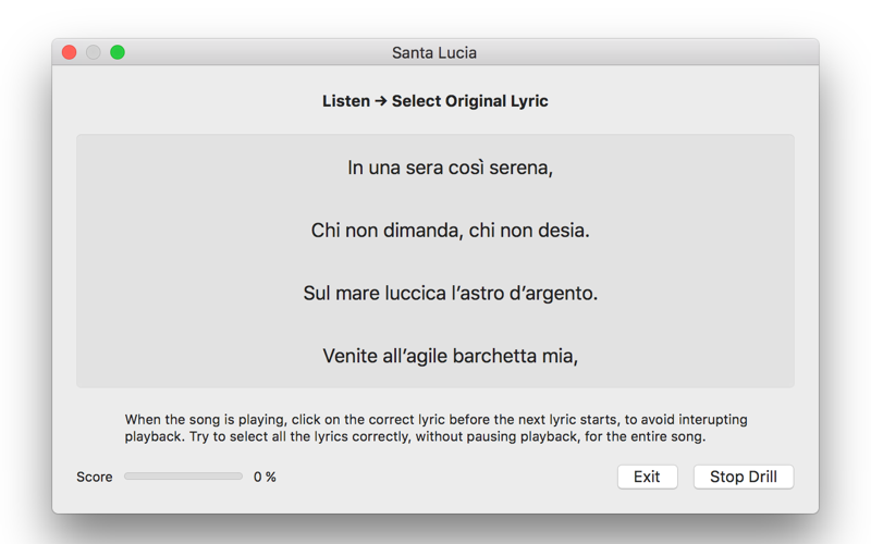 The application is free and includes two exercises for learning the song lyrics. The Pro Version can be purchased In-App and includes three additional advanced exercises to fully master learning the lyrics of a song.