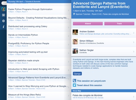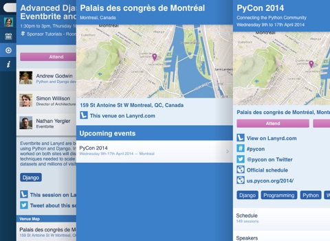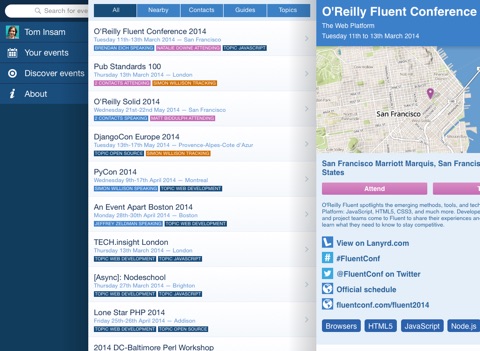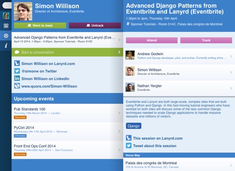 Lanyrd for iOS helps you get more out of events while youre there. It stores information about conferences youre attending directly on your device - so even when theres no wifi you can see the conference schedule, attendee & speaker directories.