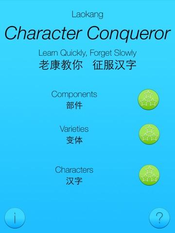 “Crack the code” to mastering characters with “Character Conqueror”! Learn the meaning of 170 root words, then acquire Chinese vocabulary quickly and forget it slowly. Do this without writing, counting strokes or learning stroke order. Demonstrate your knowledge by passing tests using the apps specially designed keyboard. Go to the head of the class; wow your friends with your amazing vocabulary.