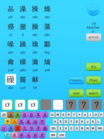 Lookup characters with components in specific positions (e.g. first or last) or in certain combinations (e.g. 立 and 日). Lookup characters by pinyin (e.g. words beginning with “zh” or ending in “ang”). Or, combine components and pinyin (e.g. find all characters with “water” beginning with “ch”). You will discover how many characters match the search criteria, and a list of the characters with pinyin. Tap one to see details on that character, including a simple definition and a sample word to remember it by.