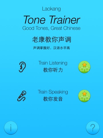 Master Chinese Tones. You can, and you will, with Laokang Tone Trainer. For students of Mandarin Chinese at all levels, this app patiently trains your tones step by step until you are proficient. Soon, you will amaze your teachers and friends with your clear and consistent tones.