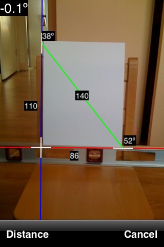 You may also note that the calculated measurements for the 8.5 x 11 paper are 8.6 and 14.This is due to rounding the angles to full degrees for display. Given the small errors that perspective introduces we felt that more precision would not be helpful. Also we discovered that using a touch interface to set tenths of degrees within a small screen area was very hard to do. We do support four digits of precision for the reference distance to reduce further rounding errors. For example if 11 was entered instead of 110 as shown, the calculated distance would be displayed as 8 rather than 86 as shown.
