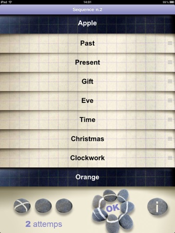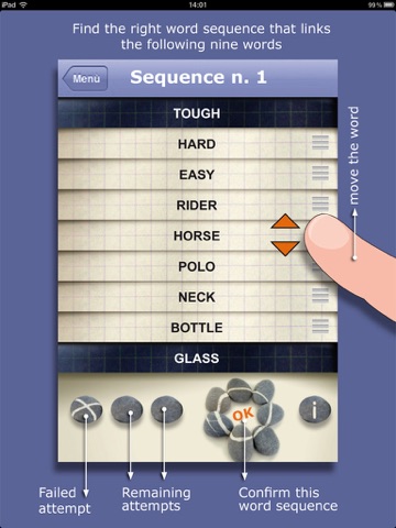 You have to put the words in a logical order to make the correct sequence and complete the chain. Every sequence has 9 words. The first and last ones are fixed. The other 7 are in a random order. The player has to change the order creating links between the words. In the correct sequence, each word forms a pair with another, i.e. the first word is linked to the second, the second to the third, etc.