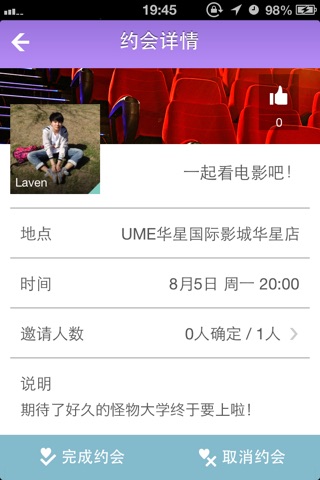 无论是传统的聚餐、唱歌、电影、泡吧、逛街,还是小清新的看展、观影、品茶、论道,亦或是潇洒的体育运动、交友旅行……无论兴趣如何,你只要在Laven发布约会信息或者搜索相关约会,都可以找到志趣相投的朋友,和她开始精彩的约会!
