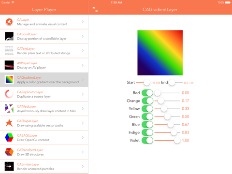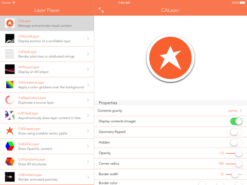 Layer Player explores the capabilities of Apples Core Animation API, specifically CALayer, CAScrollLayer, CATextLayer, AVAudioPlayer, CAGradientLayer, CAReplicatorLayer, CATiledLayer, CAShapeLayer, CAEAGLLayer, CATransformLayer, and CAEmitterLayer. Each class includes several controls to manipulate the properties of the class and observe the effects.