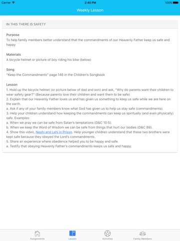 "I was just about to go spend $15 on a FHE lessons book for our family nights, and another $10 on an assignments board, then I found this app! It works very well and the lessons are really good quality, also they have new lessons each year so we never do the same lesson twice, so glad I found it!"