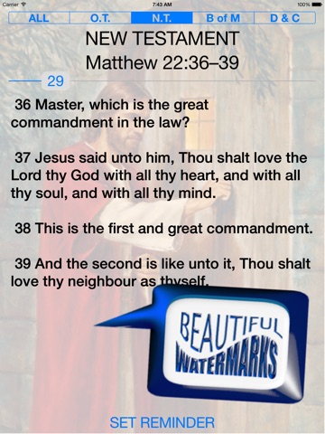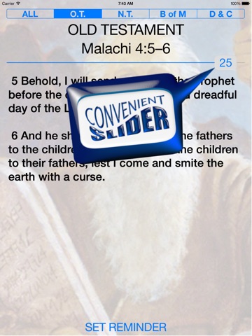 This includes the 2015 Scripture Mastery Verses divided into the four Seminary Categories: OLD TESTAMENT, NEW TESTAMENT, BOOK OF MORMON and DOCTRINE AND COVENANTS. You can limit scriptures shown to any of these categories or ALL of them. Swipe left or right to scan through or use the slider to quickly find the scripture that you want.