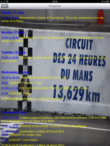 In this app I have tried to gather some of the experiences I have collected on my previous trips to Le Mans 24H