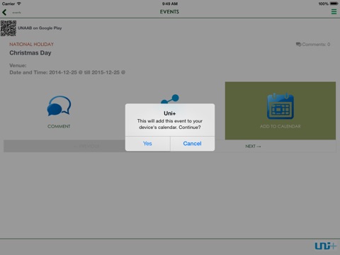 Helps you keep track of any campus and alumni activities or events, allows you add them to your calendar.