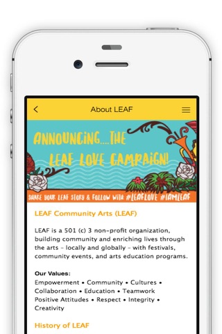 This is the OFFICIAL Mobile App for LEAF Community Arts - including schedules, maps and details for LEAF Festival & LEAF Downtown - as well as year-round info on what else the organization is up to through LEAF Schools & Streets, LEAF International and MORE!