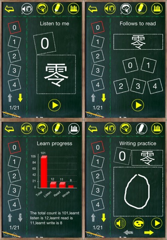 ⊙Learning module, through listen to me, follows to read, writing practice three different learning patterns, you can learn the listen, spoken, read and write of number, master the numbers shape, sound.