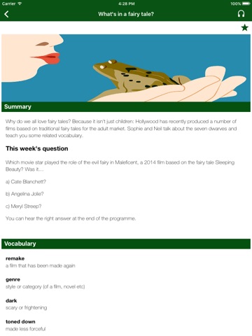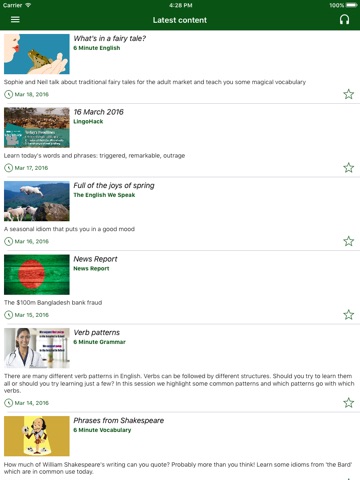 - 12 categories from BBC Learning English Program with audio, transcript, exercise.