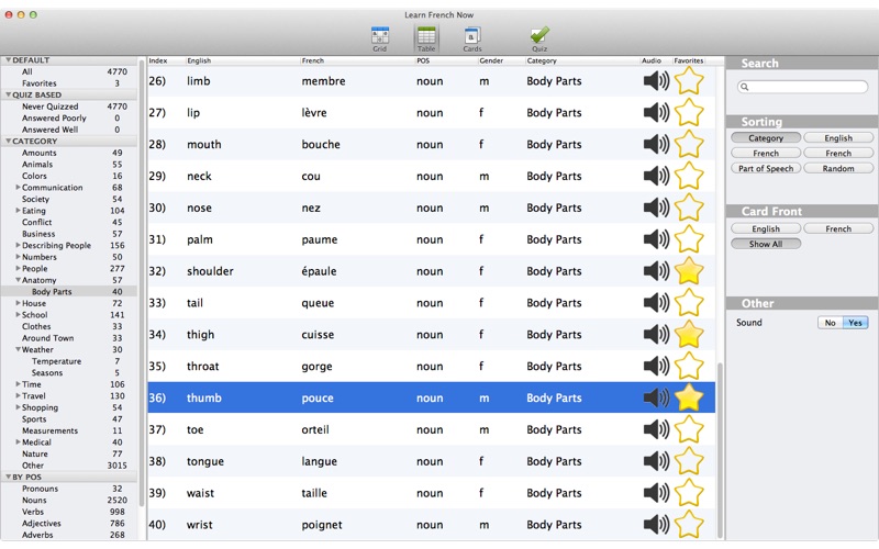 This app comes with around 200 cards absolutely free, complete with native French and English pronunciation of the words! Try out the app, and if you like how it works, you can upgrade to get over 4500 total words in various categories!