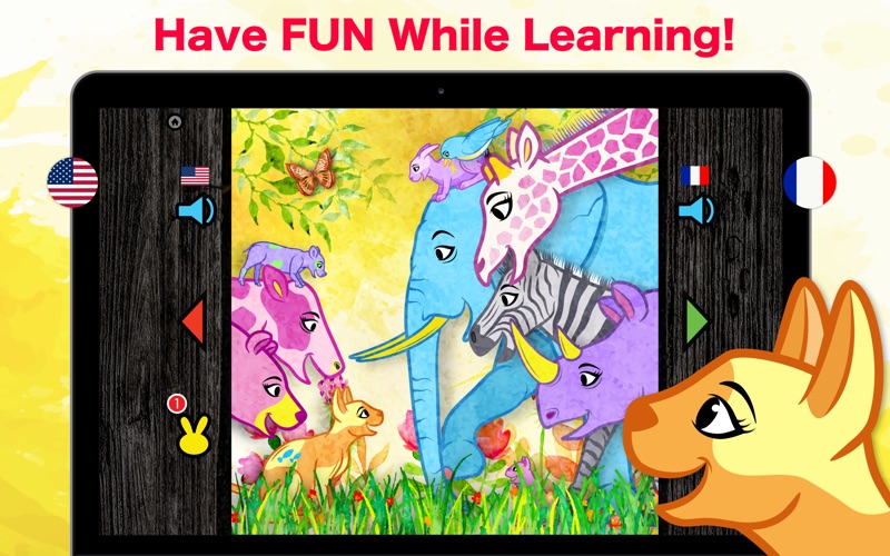 With striking and colorful graphics and animations, this FUN interactive app is designed to delight children while they learn animal names in French and English!