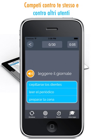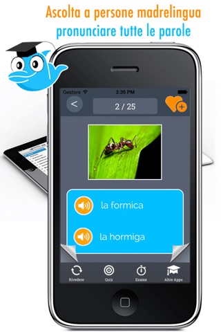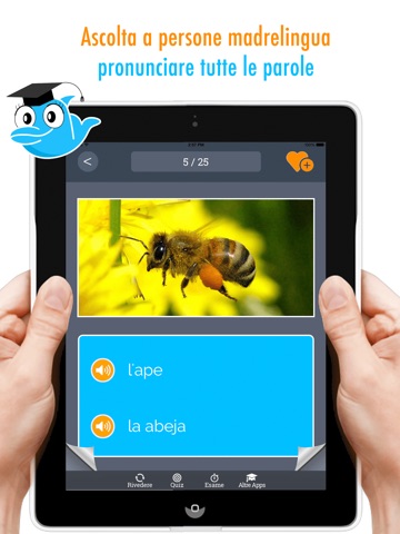 You choose a category and one by one all Spanish and Italian words with their translations are repeated. You can save the words that require more attention as favorite, and practice and test only those words. This option is used to study and learn the Spanish and Italian words. You can listen to the pronunciation of all words.