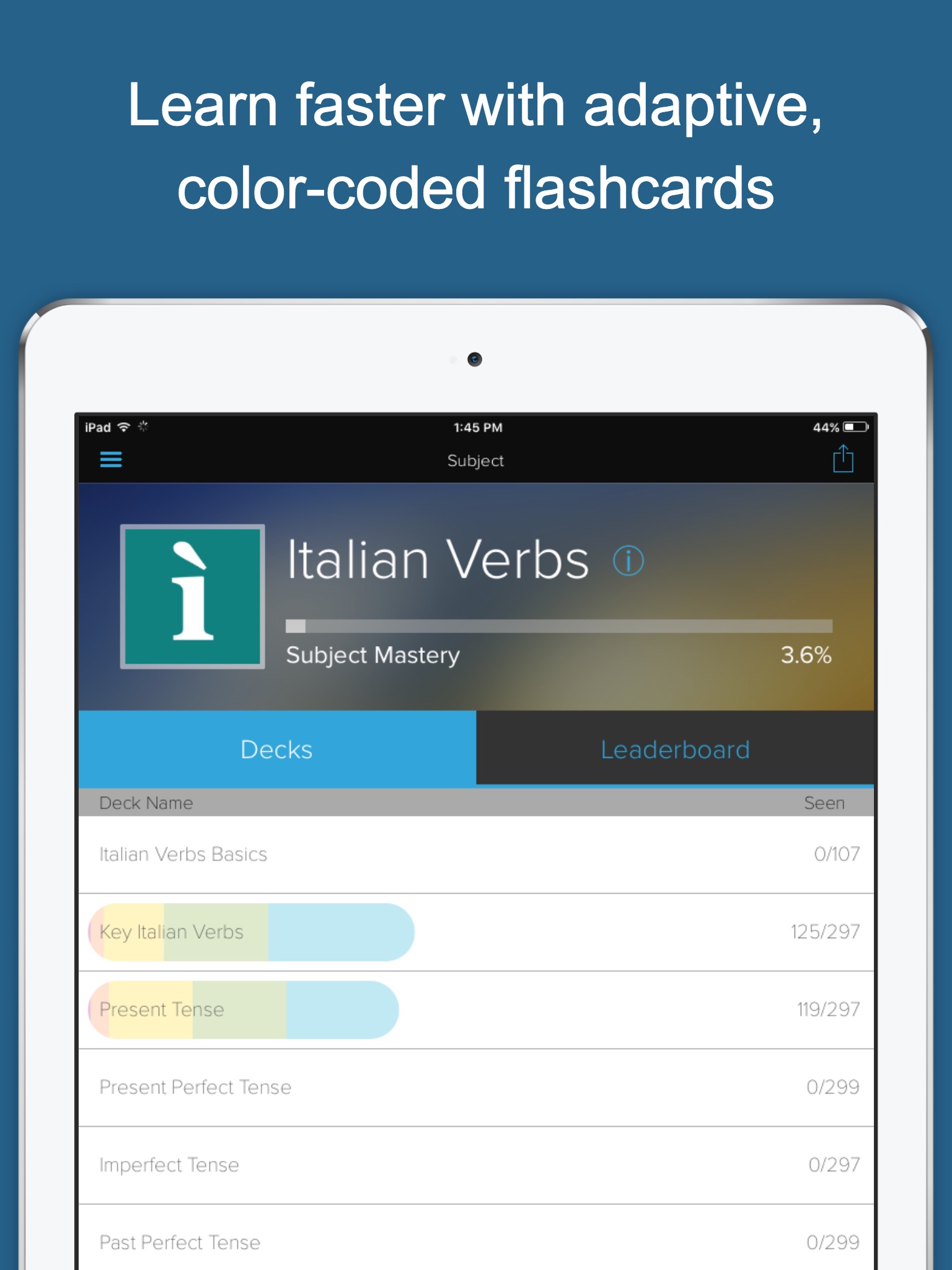 Nail the most common verbs on your Italian tests and in everyday Italian conversation. Drill yourself on Italian verbs MORE EFFICIENTLY than with any other app on iTunes. Applying the latest in cognitive science, Brainscape repeats conjugations in the optimal pattern of repetition until you have truly internalized them.