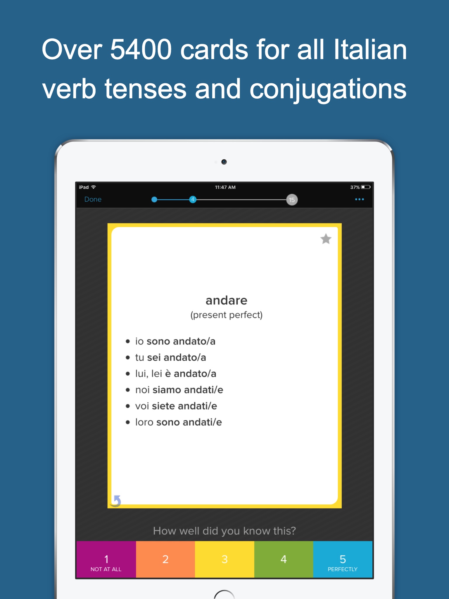 • Over 5,500 total flashcards covering conjugations for the present, simple past, imperfect, present perfect, pluperfect, future, conditional, present subjunctive, and more