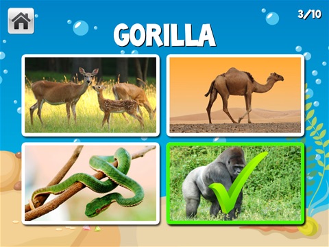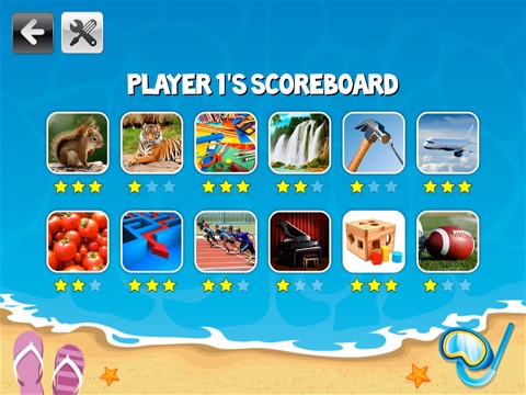 Choose from twelve different game categories: animals, more animals, preschool, nature, tools, transportation, vegetables, positions, movement, music, shapes and sports. For phonics, choose the starting letter. Select the correct picture from four (or two, if four is too difficult) flashcard images. A narrator expresses appreciation for your response whether it is correct or not, with stars awarded at the end of each game to recognize your achievements.