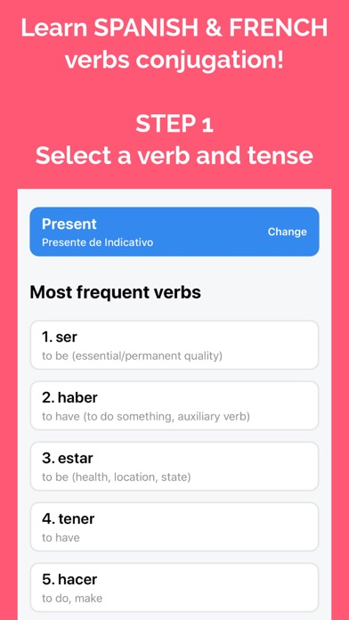 Spanish and French conjugations. NEW: 350 verbs, Dark Mode, iPad version, and multi-device Sync button! Master a new language and become fluent faster!