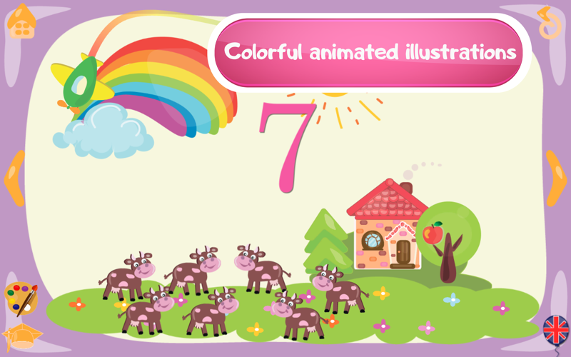 Each figure is presented in such a way that a kid can easily remember it. Bright animated picture and a rhyme voiced by a speaker will help him. Images “come alive” when you click on it. A kid can turn on rain, wake up a bear, feed a frog, etc.